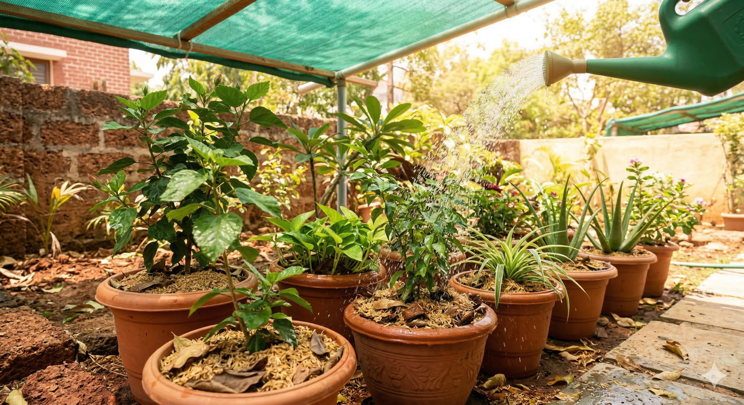 Few plants can withstand extreme heat, but some cannot. Such plants should be protected from direct sun heat and light. Trees like Adavi Ganneru, Mango and Guava do not need protection from sun light. Try to place your heat sensitive plants under these plants to provide partial protection. You can also move the plants to the shady areas in your house.